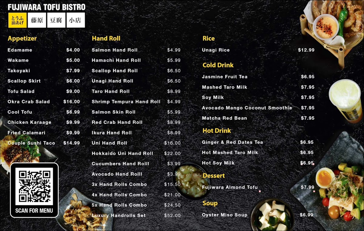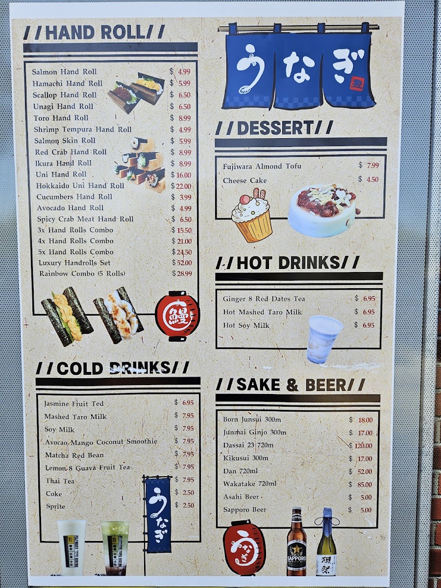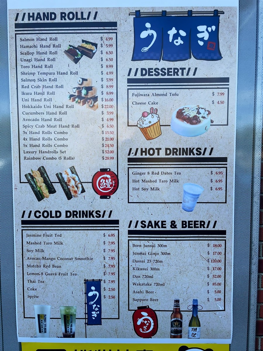 California hand roll Salmon skin roll Avocado hand roll Unagi hand roll Shrimp tempura hand roll